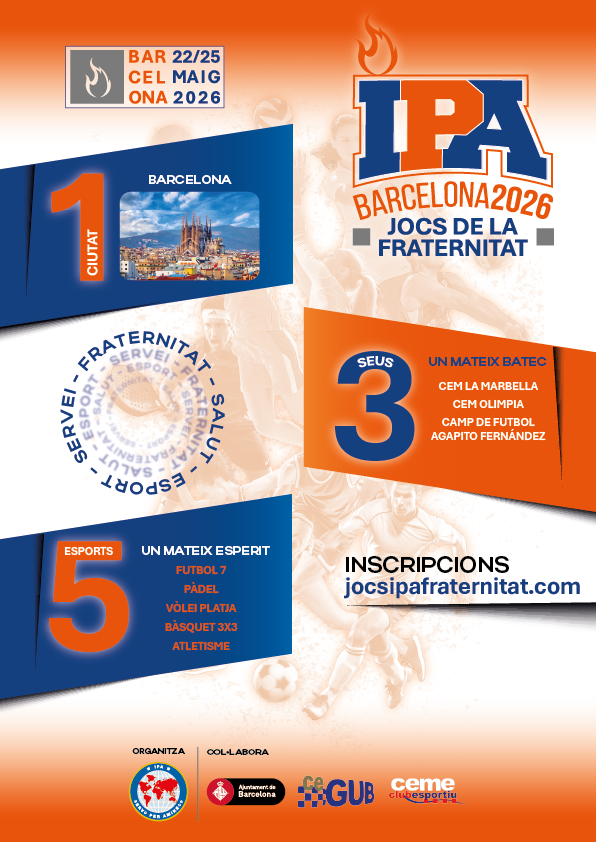 L’Agrupació d’IPA Barcelona ens faciliten informació dels pròxims JOCS DE LA FRATERNITAT 2026 que se celebraran a Barcelona del 22 al 25 de maig de 2026. Podeu consultar la informació a la web: https://jocsipafraternitat.com/ca/ A partir del dia 15 d’octubre estarà en funcionament i ben aviat s’obrirà el període d’inscripcions.