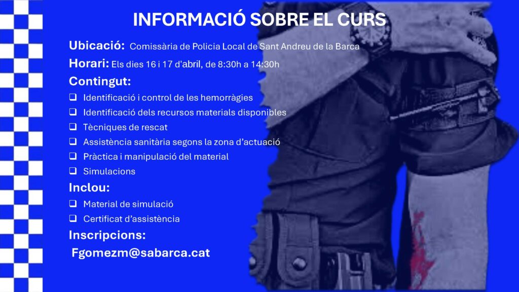 IPA Baix Llobregat organitza els propers dies 16 i 17 d’abril a Sant Andreu de la Barca un curs sobre Sanitat Tàctica gratuït, en col·laboració amb Train As You Fight i la Policia Local de Sant Andreu de la Barca.